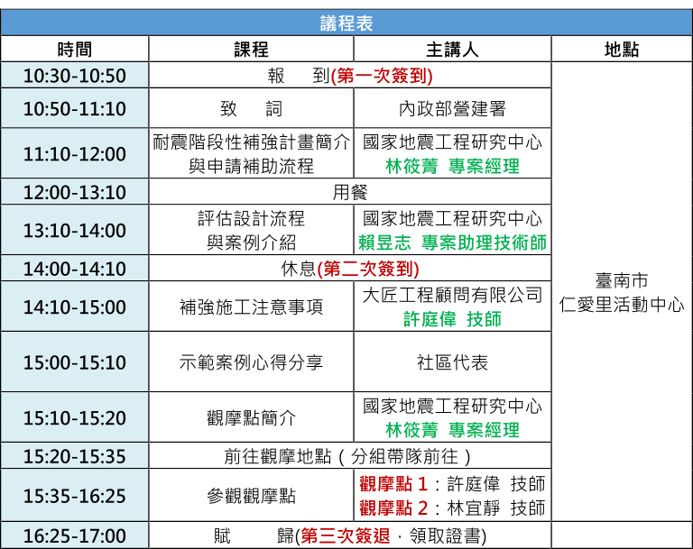 2020-10-19 私有建築物耐震階段性補強說明會暨觀摩活動 (臺南場) 已截止活動 / By cyslin / 2020 年 9 月 10 日 2022 年 7 月 13 日 講習日期:2020-10-19 (一) 上午10時至下午17時講習內容:耐震階段性補強計畫簡介與申請補助流程、評估設計流程與案例介紹、補強施工注意事項、示範案例心得分享、觀摩點簡介、參觀觀摩點。講習對象:專業技師、建築師、施工廠商、公務人員與一般民眾。講習地點:臺南市仁愛里活動中心報名日期:即日起至2020-10-12 (人數上限70人,額滿為止)報名費用:免費【本場地無提供停車位。如有需要,敬請於本場地外圍尋找停車位】報名網頁耐震階段性補強計畫簡介與申請補助流程(PDF檔)耐震階段性補強設計工法與案例分享(PDF檔)耐震階段性補強施工注意事項(PDF檔)